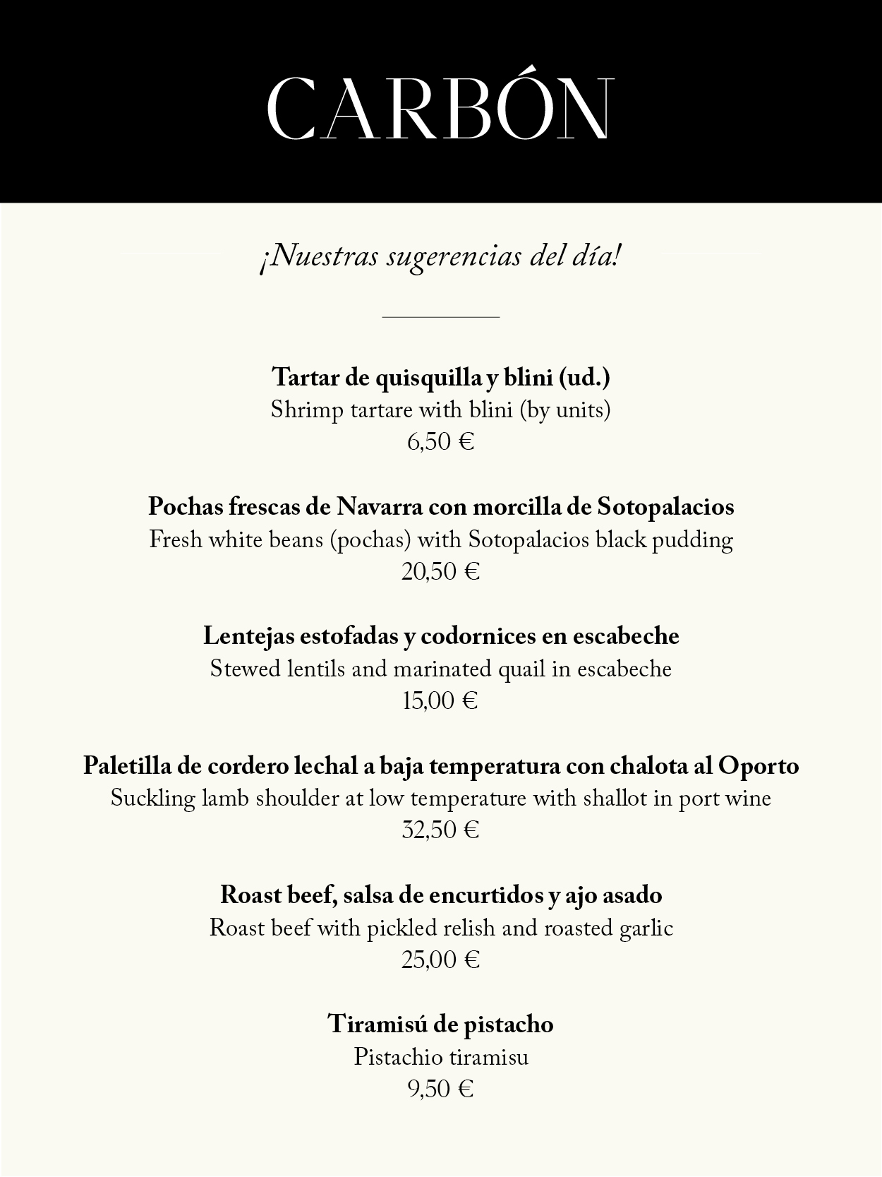 Ensaladilla «Carbón» “Carbón ” Olivier Salad 9,00 € 17,00 €