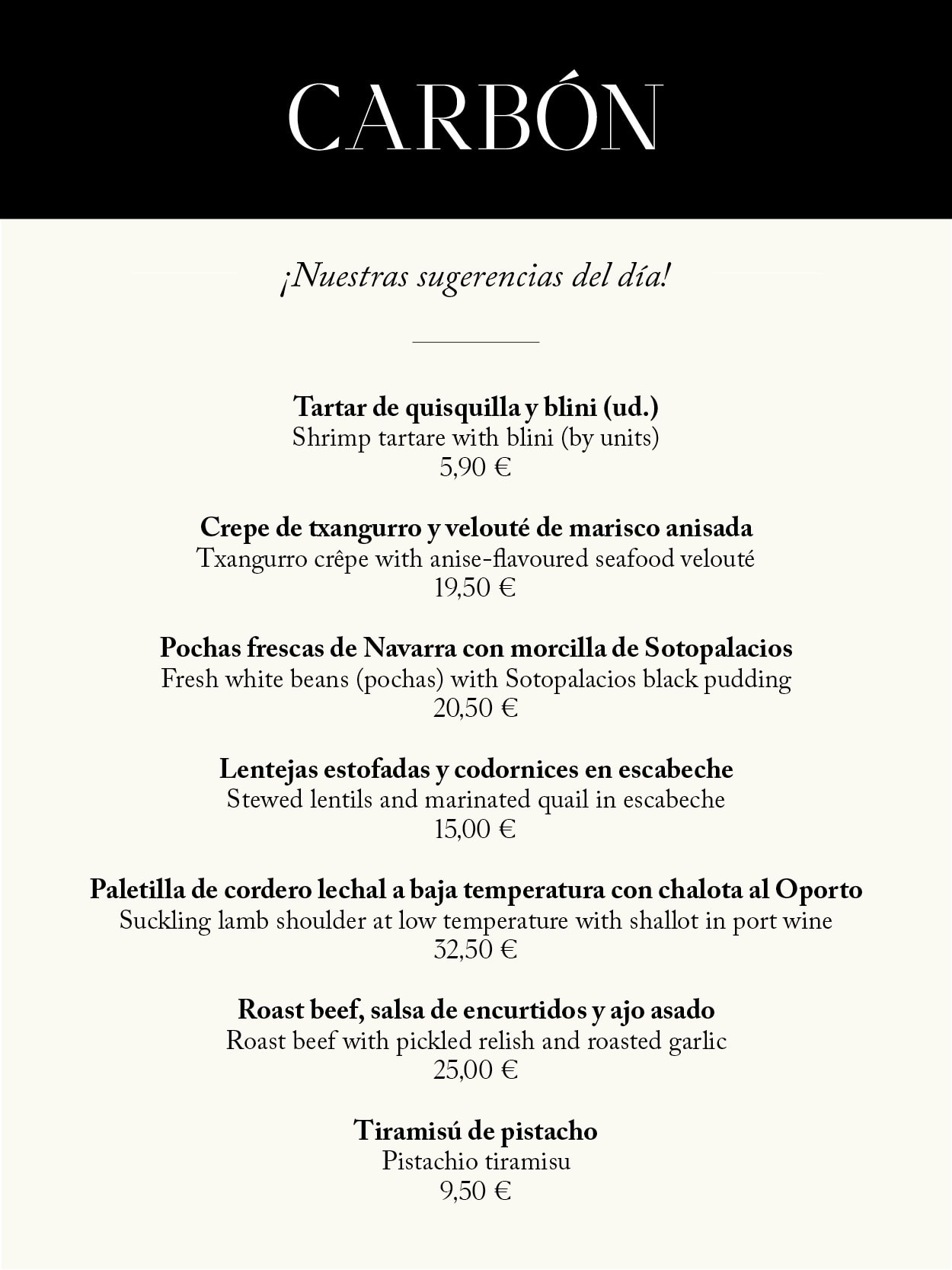 | Ensaladilla «Carbón» | “Carbón ” Olivier Salad | 9,00 € | 17,00 € |