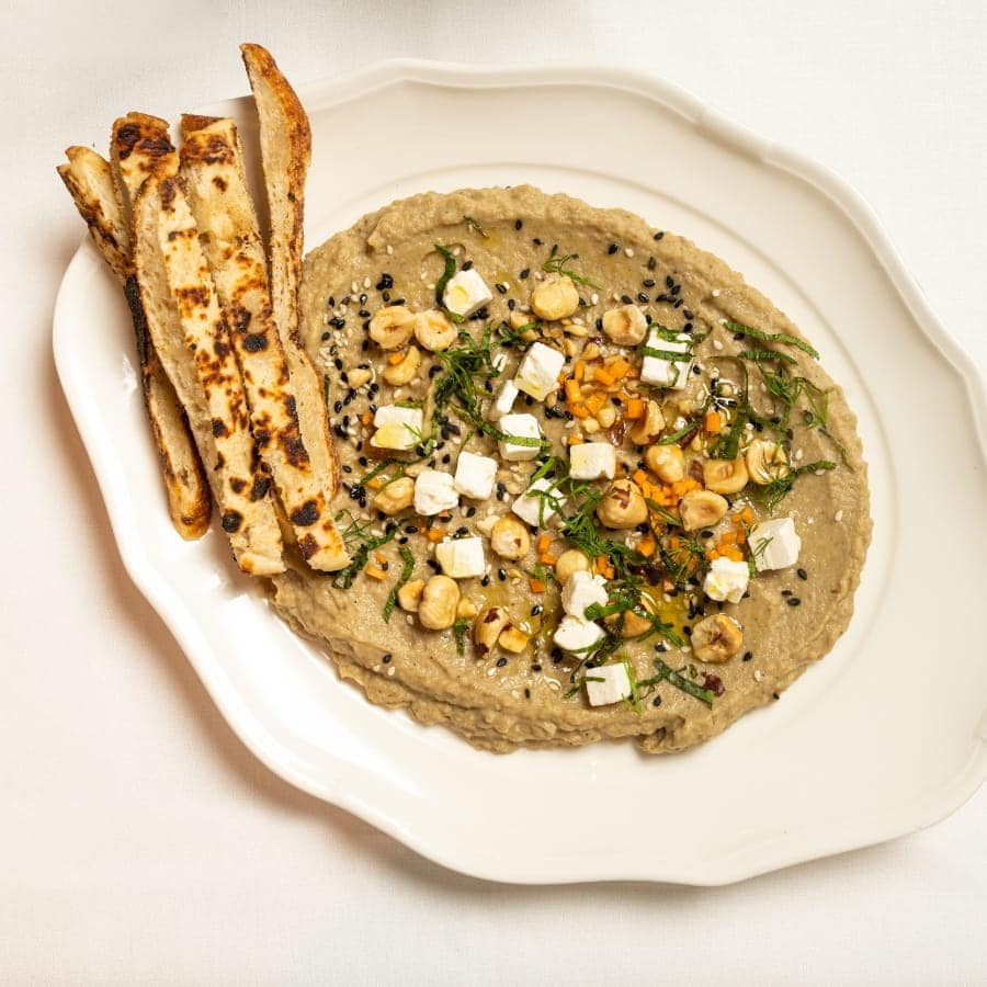| Hummus de berenjena escalivada a la leña, avellanas y queso fresco | Grilled wood-fired eggplant hummus with hazelnuts and fresh cheese | 16,00 € | |