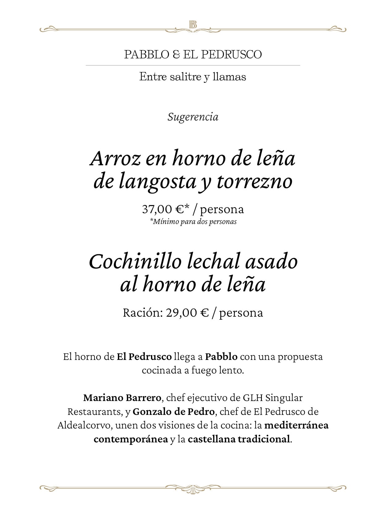 | Los macarrones de Don Pabblo, con tomate guisado y chorizo picante de León | Don Pabblo’s macaroni with spicy chorizo from León | 20,00 € | |